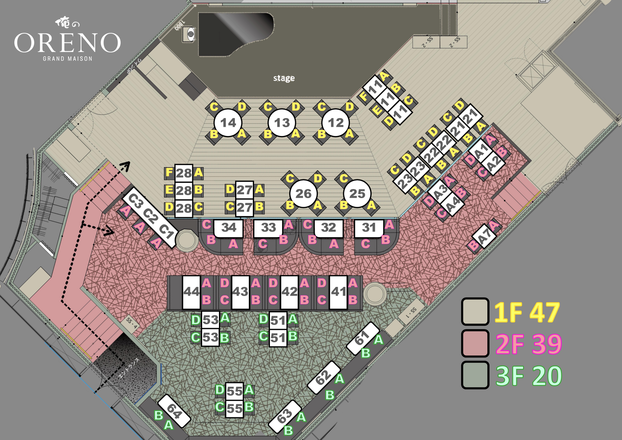 2名掛けのお席は席番号が離れている場合がありますが、お連れ様と向かい合うお席となります。